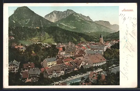 AK Aussee, Ortsansicht mit Kirche und Bergpanorama