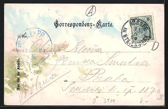 Personenbezogene Daten auf der Rückseite der Karte wurden durch blauen Textmarker unkenntlich gemacht. Die blauen Stellen sind auf die Vorderseite durchgeweicht und wirken sich negativ auf das Postkartenfoto aus