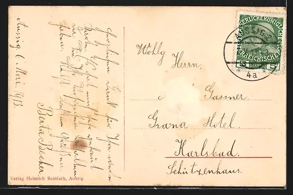 alte Ansichtskarte, gelaufen 1913, rückseitig Oberflächenschaden, guter Zustand