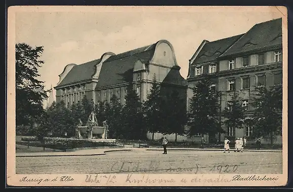 AK Aussig / Usti, Brunnen an der Stadtbücherei