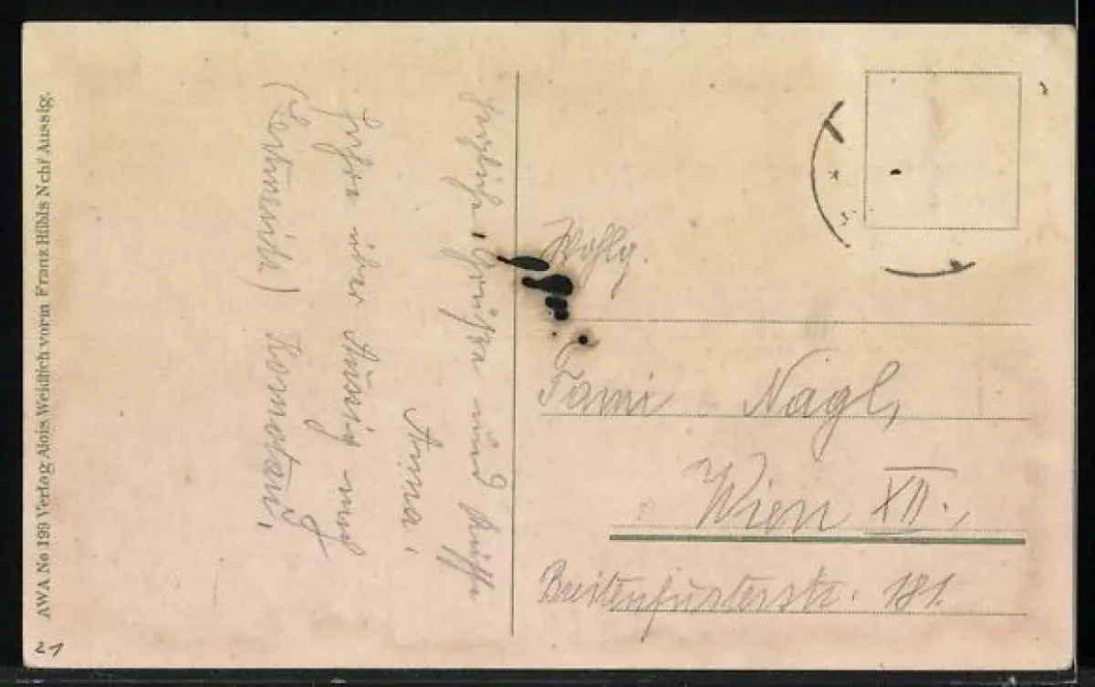 Personenbezogene Daten auf der Rückseite der Karte wurden durch blauen Textmarker unkenntlich gemacht. Die blauen Stellen sind auf die Vorderseite durchgeweicht und wirken sich negativ auf das Postkartenfoto aus