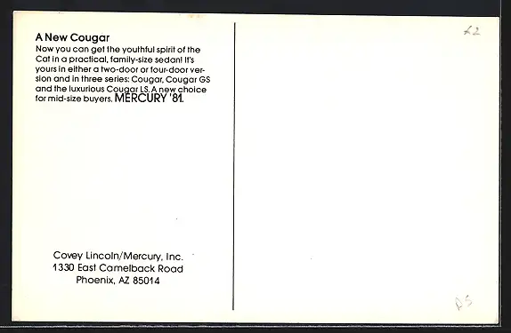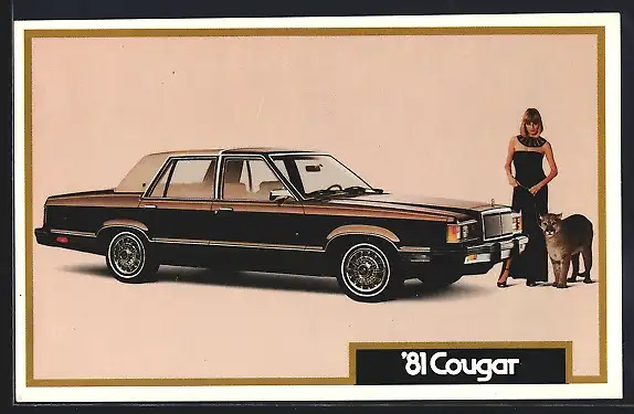 AK Auto `81 Cougar, Mercury `81, Dame im Abendkleid mit Puma an der Leine