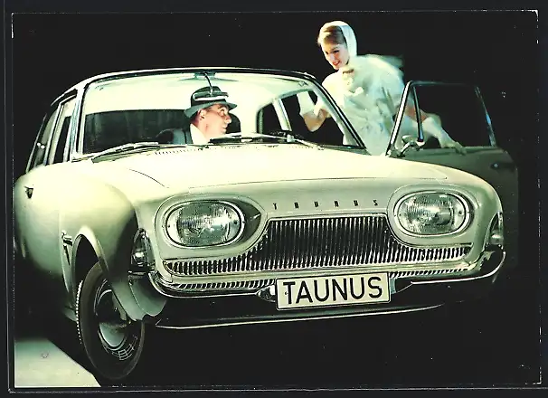 AK Auto Ford Taunus 17 M, elegante Dame steigt zu