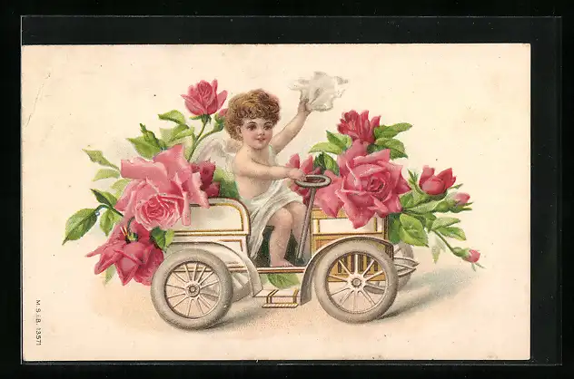 AK Auto, Kleiner Engel in einem Auto voll von Rosen