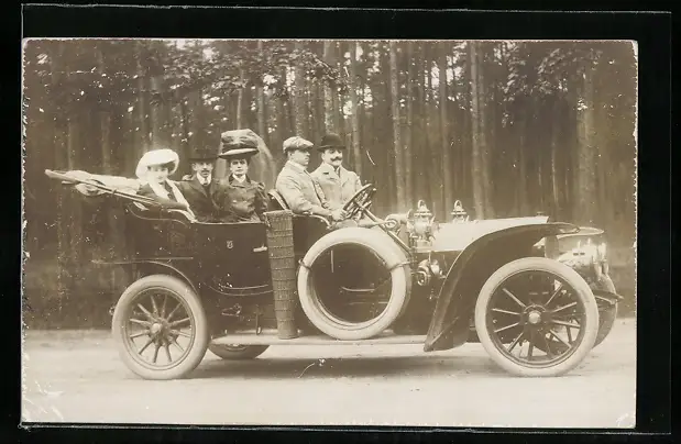 AK Auto, Mann fährt vier Passagiere an einem Nutzforst entlang