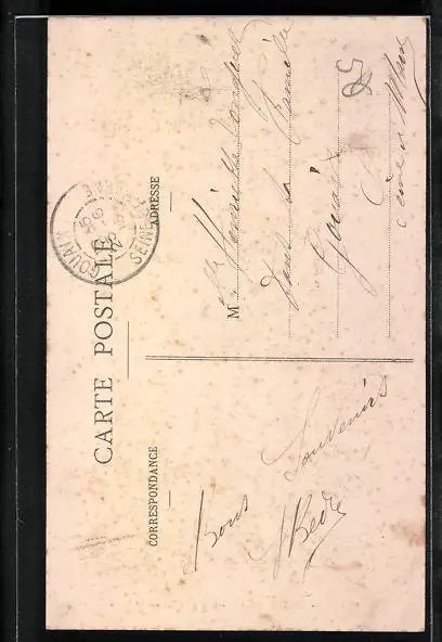 Personenbezogene Daten auf der Rückseite der Karte wurden durch blauen Textmarker unkenntlich gemacht. Die blauen Stellen sind auf die Vorderseite durchgeweicht und wirken sich negativ auf das Postkartenfoto aus