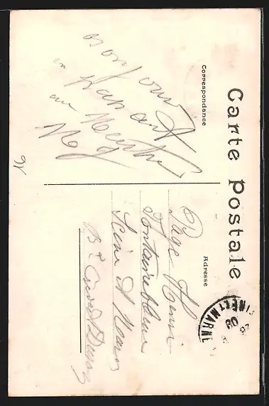 Personenbezogene Daten auf der Rückseite der Karte wurden durch blauen Textmarker unkenntlich gemacht. Die blauen Stellen sind auf die Vorderseite durchgeweicht und wirken sich negativ auf das Postkartenfoto aus