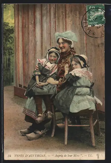 AK Auvergne, Aupres de leur Mere, Kleine Mädchen in Trachten auf dem Schoss ihrer Mutter
