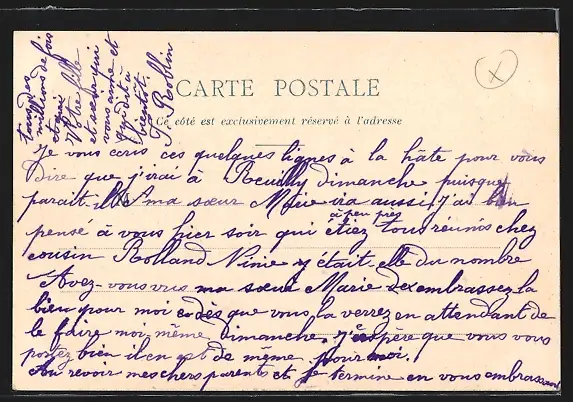 Personenbezogene Daten auf der Rückseite der Karte wurden durch blauen Textmarker unkenntlich gemacht. Die blauen Stellen sind auf die Vorderseite durchgeweicht und wirken sich negativ auf das Postkartenfoto aus