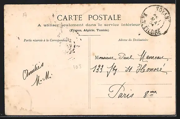 Personenbezogene Daten auf der Rückseite der Karte wurden durch blauen Textmarker unkenntlich gemacht. Die blauen Stellen sind auf die Vorderseite durchgeweicht und wirken sich negativ auf das Postkartenfoto aus