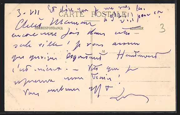 Personenbezogene Daten auf der Rückseite der Karte wurden durch blauen Textmarker unkenntlich gemacht. Die blauen Stellen sind auf die Vorderseite durchgeweicht und wirken sich negativ auf das Postkartenfoto aus
