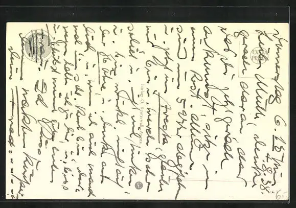 Personenbezogene Daten auf der Rückseite der Karte wurden durch blauen Textmarker unkenntlich gemacht. Die blauen Stellen sind auf die Vorderseite durchgeweicht und wirken sich negativ auf das Postkartenfoto aus