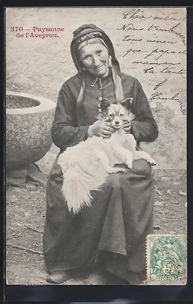AK Aveyron, Paysanne, Französin in Tracht d. Pyrenäen / Pyrénées mit Hund