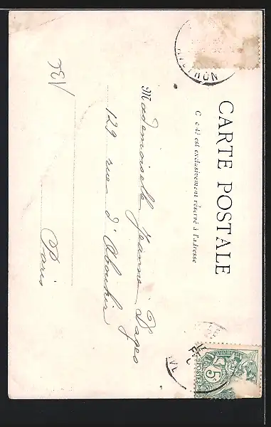 Personenbezogene Daten auf der Rückseite der Karte wurden durch blauen Textmarker unkenntlich gemacht. Die blauen Stellen sind auf die Vorderseite durchgeweicht und wirken sich negativ auf das Postkartenfoto aus