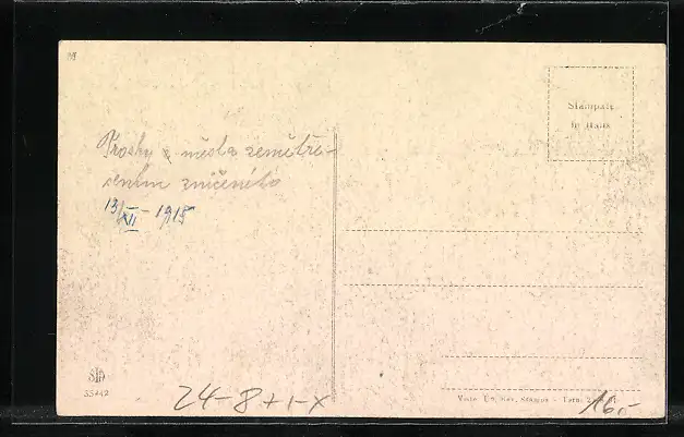 Personenbezogene Daten auf der Rückseite der Karte wurden durch blauen Textmarker unkenntlich gemacht. Die blauen Stellen sind auf die Vorderseite durchgeweicht und wirken sich negativ auf das Postkartenfoto aus