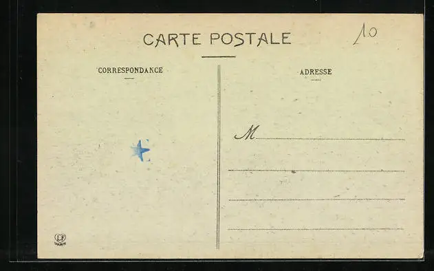 Personenbezogene Daten auf der Rückseite der Karte wurden durch blauen Textmarker unkenntlich gemacht. Die blauen Stellen sind auf die Vorderseite durchgeweicht und wirken sich negativ auf das Postkartenfoto aus