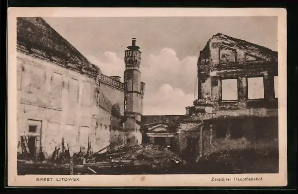 AK B rest-Litowsk, zerstörter Hauptbahnhof