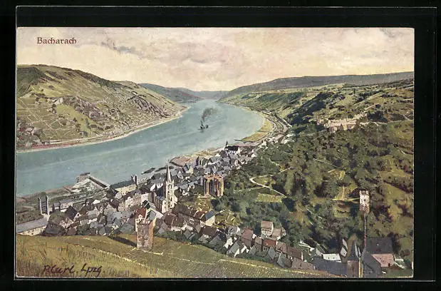 AK Bacharach, Ortsansicht und Rheinpartie aus der Vogelschau