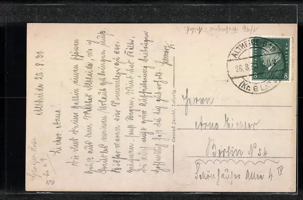 Personenbezogene Daten auf der Rückseite der Karte wurden durch blauen Textmarker unkenntlich gemacht. Die blauen Stellen sind auf die Vorderseite durchgeweicht und wirken sich negativ auf das Postkartenfoto aus
