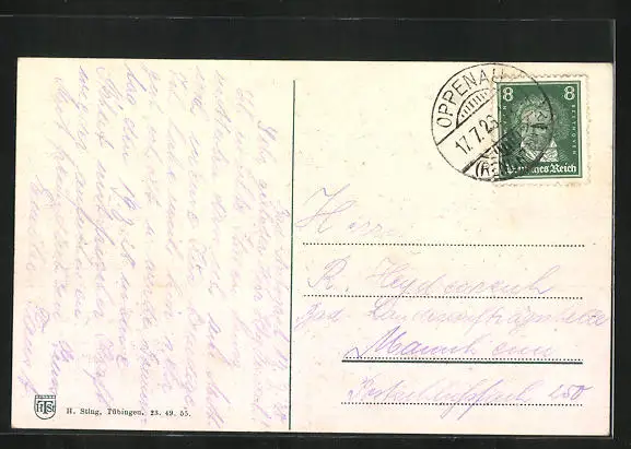 Personenbezogene Daten auf der Rückseite der Karte wurden durch blauen Textmarker unkenntlich gemacht. Die blauen Stellen sind auf die Vorderseite durchgeweicht und wirken sich negativ auf das Postkartenfoto aus