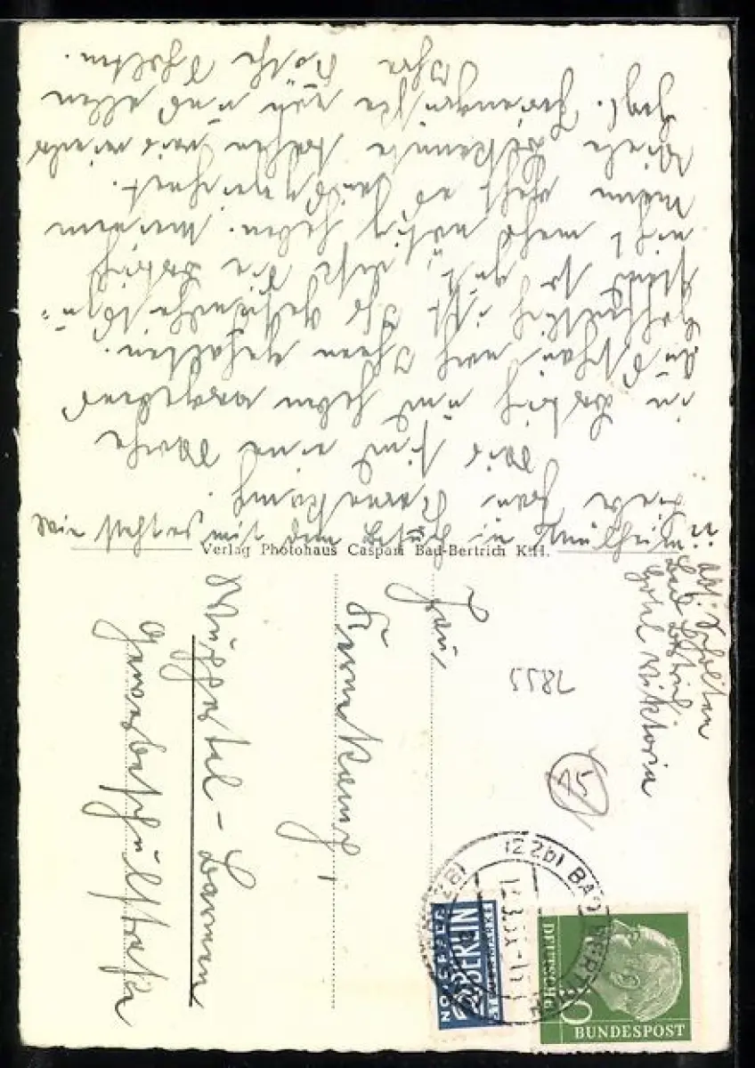 Personenbezogene Daten auf der Rückseite der Karte wurden durch blauen Textmarker unkenntlich gemacht. Die blauen Stellen sind auf die Vorderseite durchgeweicht und wirken sich negativ auf das Postkartenfoto aus