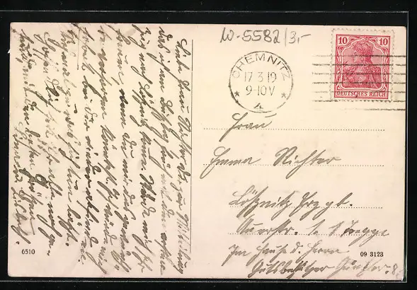 Personenbezogene Daten auf der Rückseite der Karte wurden durch blauen Textmarker unkenntlich gemacht. Die blauen Stellen sind auf die Vorderseite durchgeweicht und wirken sich negativ auf das Postkartenfoto aus