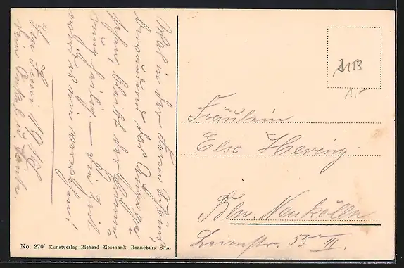 Personenbezogene Daten auf der Rückseite der Karte wurden durch blauen Textmarker unkenntlich gemacht. Die blauen Stellen sind auf die Vorderseite durchgeweicht und wirken sich negativ auf das Postkartenfoto aus