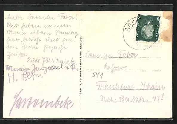 Personenbezogene Daten auf der Rückseite der Karte wurden durch blauen Textmarker unkenntlich gemacht. Die blauen Stellen sind auf die Vorderseite durchgeweicht und wirken sich negativ auf das Postkartenfoto aus