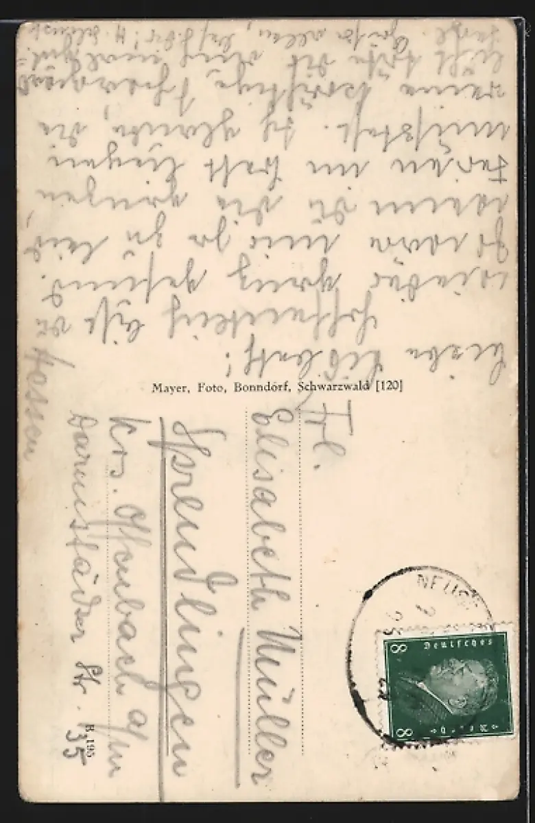 Personenbezogene Daten auf der Rückseite der Karte wurden durch blauen Textmarker unkenntlich gemacht. Die blauen Stellen sind auf die Vorderseite durchgeweicht und wirken sich negativ auf das Postkartenfoto aus