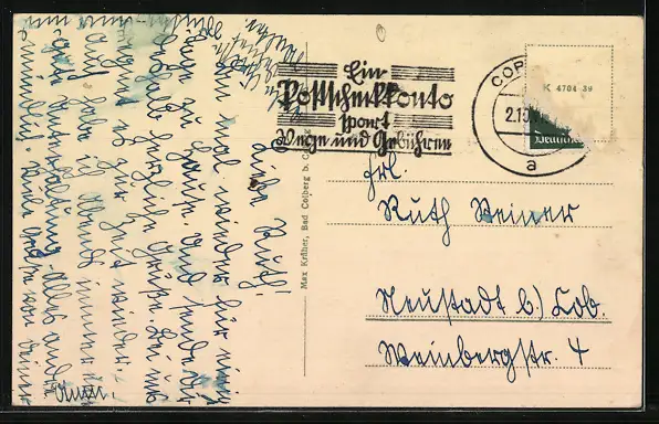 Personenbezogene Daten auf der Rückseite der Karte wurden durch blauen Textmarker unkenntlich gemacht. Die blauen Stellen sind auf die Vorderseite durchgeweicht und wirken sich negativ auf das Postkartenfoto aus