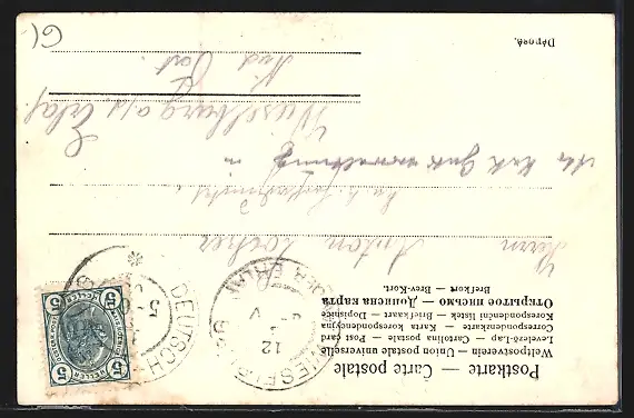 Personenbezogene Daten auf der Rückseite der Karte wurden durch blauen Textmarker unkenntlich gemacht. Die blauen Stellen sind auf die Vorderseite durchgeweicht und wirken sich negativ auf das Postkartenfoto aus