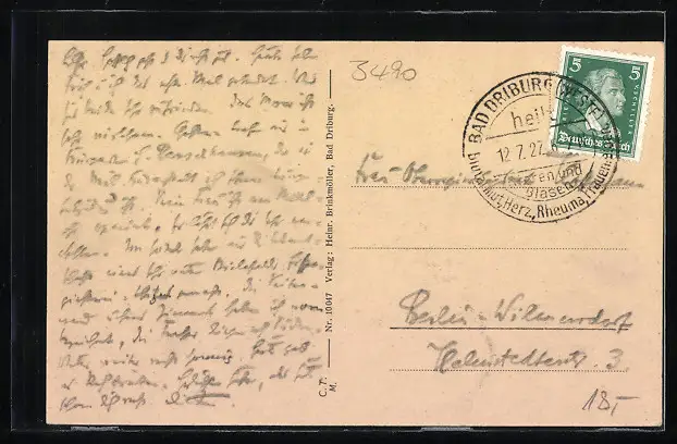 Personenbezogene Daten auf der Rückseite der Karte wurden durch blauen Textmarker unkenntlich gemacht. Die blauen Stellen sind auf die Vorderseite durchgeweicht und wirken sich negativ auf das Postkartenfoto aus