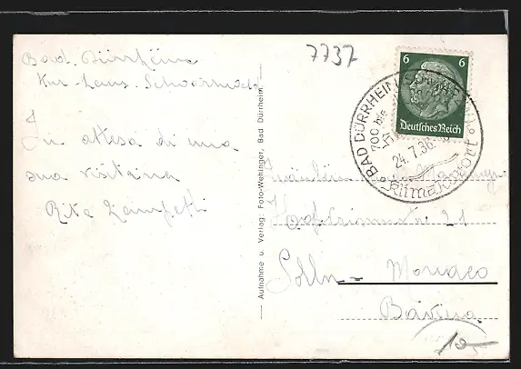 Personenbezogene Daten auf der Rückseite der Karte wurden durch blauen Textmarker unkenntlich gemacht. Die blauen Stellen sind auf die Vorderseite durchgeweicht und wirken sich negativ auf das Postkartenfoto aus