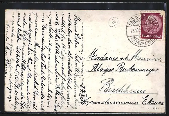 Personenbezogene Daten auf der Rückseite der Karte wurden durch blauen Textmarker unkenntlich gemacht. Die blauen Stellen sind auf die Vorderseite durchgeweicht und wirken sich negativ auf das Postkartenfoto aus