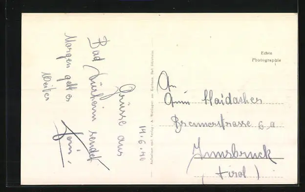 Personenbezogene Daten auf der Rückseite der Karte wurden durch blauen Textmarker unkenntlich gemacht. Die blauen Stellen sind auf die Vorderseite durchgeweicht und wirken sich negativ auf das Postkartenfoto aus