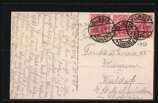 Personenbezogene Daten auf der Rückseite der Karte wurden durch blauen Textmarker unkenntlich gemacht. Die blauen Stellen sind auf die Vorderseite durchgeweicht und wirken sich negativ auf das Postkartenfoto aus