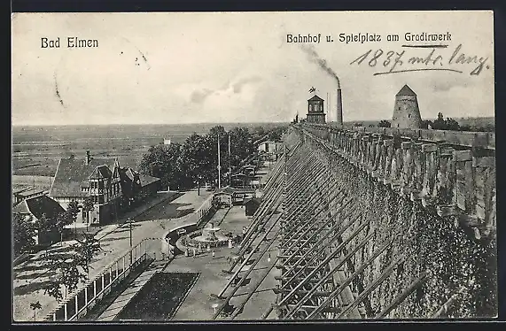 AK Bad Elmen, Bahnhof & Spielplatz am Gradierwerk