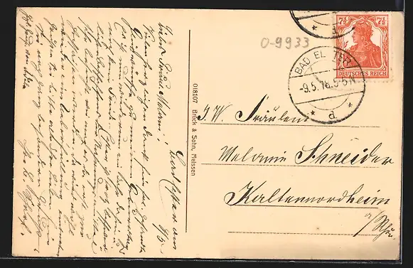 Personenbezogene Daten auf der Rückseite der Karte wurden durch blauen Textmarker unkenntlich gemacht. Die blauen Stellen sind auf die Vorderseite durchgeweicht und wirken sich negativ auf das Postkartenfoto aus