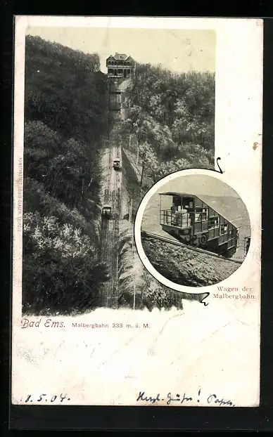 AK Bad Ems, Malbergbahn, Wagen der Bergbahn, Blick zur Bergstation