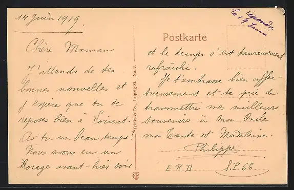 Personenbezogene Daten auf der Rückseite der Karte wurden durch blauen Textmarker unkenntlich gemacht. Die blauen Stellen sind auf die Vorderseite durchgeweicht und wirken sich negativ auf das Postkartenfoto aus