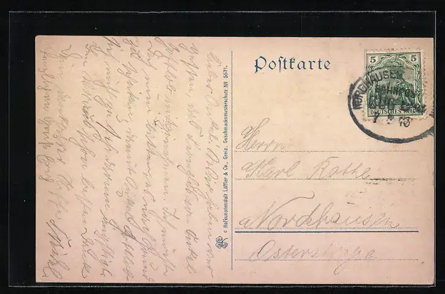 Personenbezogene Daten auf der Rückseite der Karte wurden durch blauen Textmarker unkenntlich gemacht. Die blauen Stellen sind auf die Vorderseite durchgeweicht und wirken sich negativ auf das Postkartenfoto aus