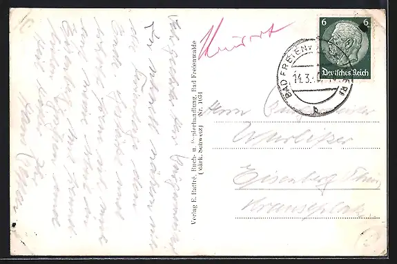 Personenbezogene Daten auf der Rückseite der Karte wurden durch blauen Textmarker unkenntlich gemacht. Die blauen Stellen sind auf die Vorderseite durchgeweicht und wirken sich negativ auf das Postkartenfoto aus