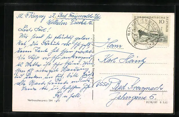 Personenbezogene Daten auf der Rückseite der Karte wurden durch blauen Textmarker unkenntlich gemacht. Die blauen Stellen sind auf die Vorderseite durchgeweicht und wirken sich negativ auf das Postkartenfoto aus
