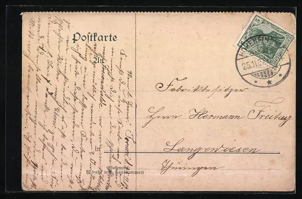 alte Ansichtskarte, gelaufen 1907, Eckknick oben re., Bugspur li. oben u. li. unten, guter Zustand