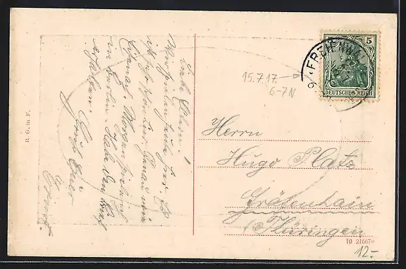 Personenbezogene Daten auf der Rückseite der Karte wurden durch blauen Textmarker unkenntlich gemacht. Die blauen Stellen sind auf die Vorderseite durchgeweicht und wirken sich negativ auf das Postkartenfoto aus