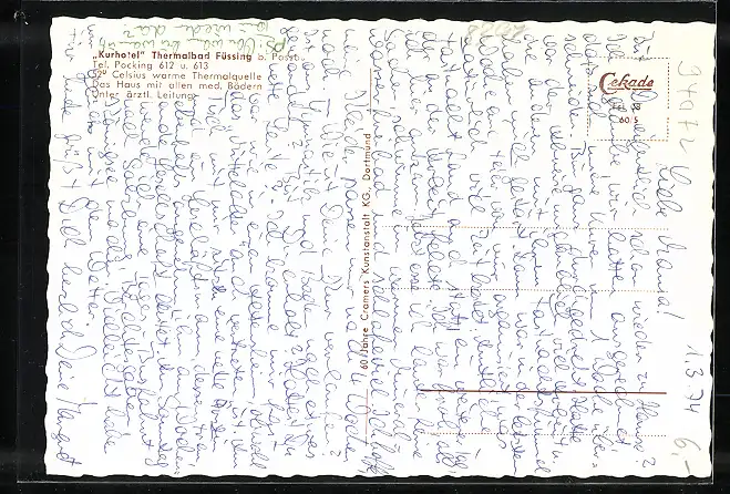 Personenbezogene Daten auf der Rückseite der Karte wurden durch blauen Textmarker unkenntlich gemacht. Die blauen Stellen sind auf die Vorderseite durchgeweicht und wirken sich negativ auf das Postkartenfoto aus