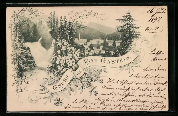 AK Bad Gastein, Ortsansicht aus der Vogelschau, Wasserfall