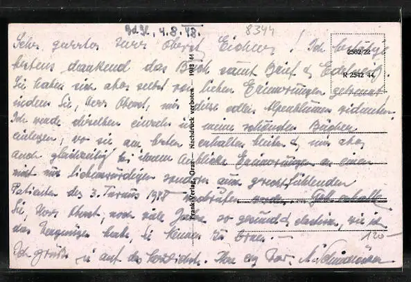 Personenbezogene Daten auf der Rückseite der Karte wurden durch blauen Textmarker unkenntlich gemacht. Die blauen Stellen sind auf die Vorderseite durchgeweicht und wirken sich negativ auf das Postkartenfoto aus