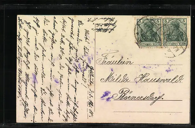 Personenbezogene Daten auf der Rückseite der Karte wurden durch blauen Textmarker unkenntlich gemacht. Die blauen Stellen sind auf die Vorderseite durchgeweicht und wirken sich negativ auf das Postkartenfoto aus