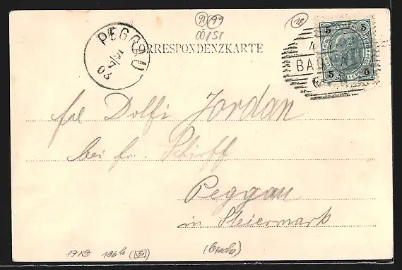 Personenbezogene Daten auf der Rückseite der Karte wurden durch blauen Textmarker unkenntlich gemacht. Die blauen Stellen sind auf die Vorderseite durchgeweicht und wirken sich negativ auf das Postkartenfoto aus